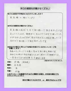 首・肩・腰の症状を全て取り除いて頂き良かったです.足のふくらはぎ:施術中に左のふくらはぎも凝っていたのが分かっていたのですが、実はそれ以上に右足も凝っていて合わせて取り除いて頂き良かったです。